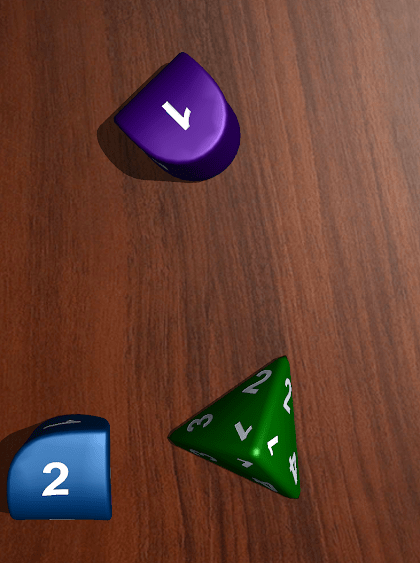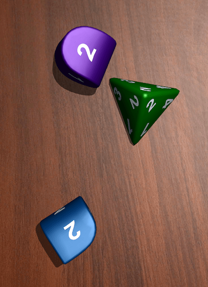 - Get the random numbers. I do this by opening the Dice app, which automatically rolls my green four-sided die, my blue three-sided die, and my purple two-sided die. The D3 and D2 are hard to tell apart visually, so I use rainbow order to distinguish them (basically anytime the D3 isn’t 3).